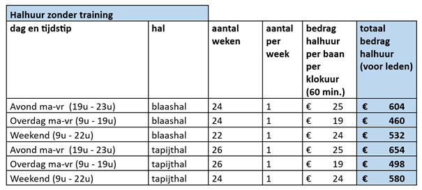 De huur zal per geheel klokuur plaatsvinden. De tarieven voor blaashal en tapijthal zijn gelijk en voor leden houden we de pakketten en bedragen in de tabel aan. Voor niet-leden is er een opslag van € 2,50 per uur.