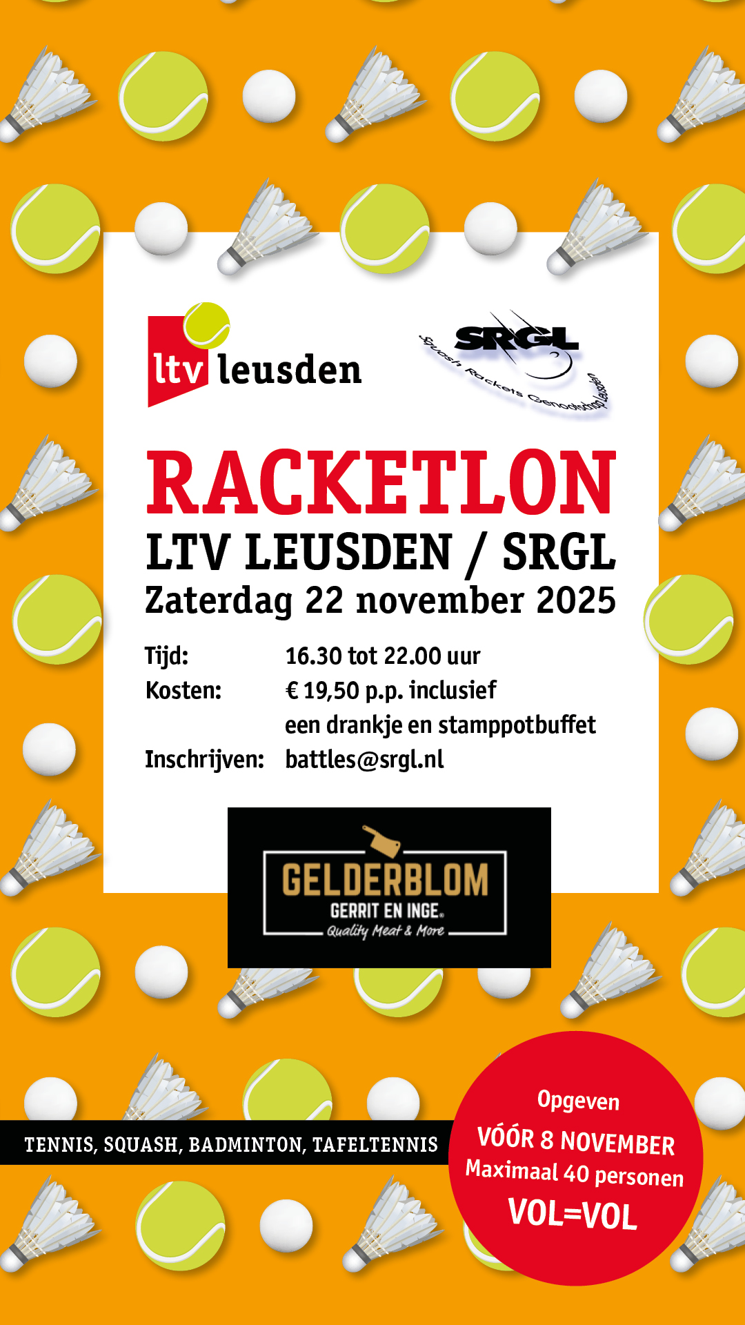 LTV Leusden en SRGL organiseren weer een Racketlon en wel op zaterdag 22 november. Een gezellige avond met tennis, squash, badminton en tafeltennis.
