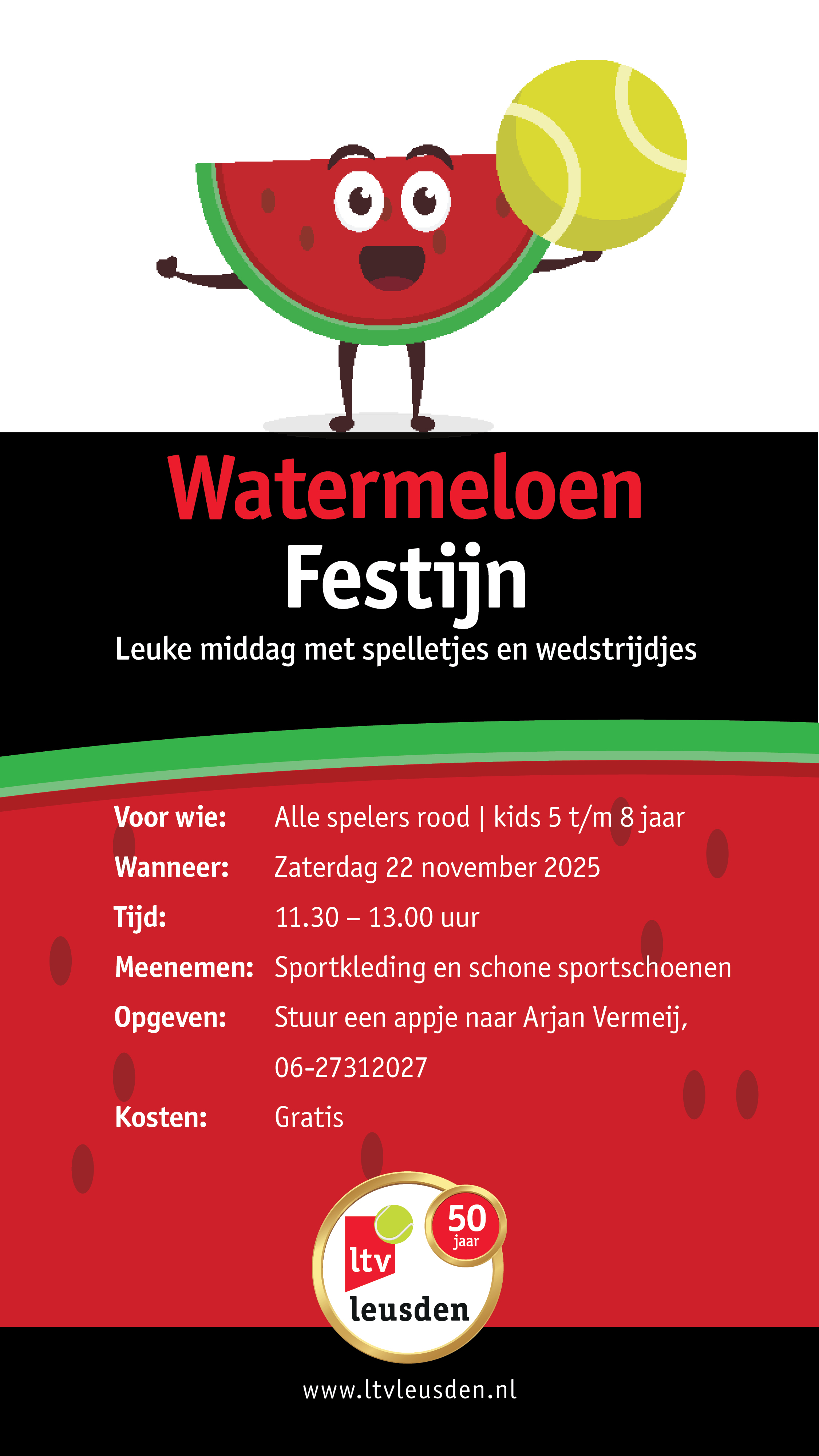 In de komende tijd organiseren we voor de jongste jeugd het Watermeloen Festijn, een leuke middag met tennisspelletjes en wedstrijdjes.